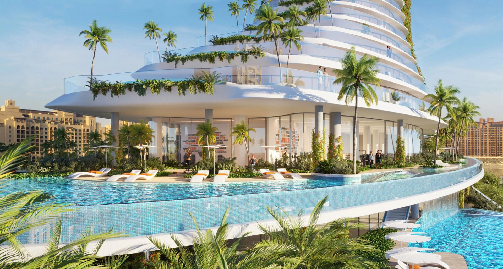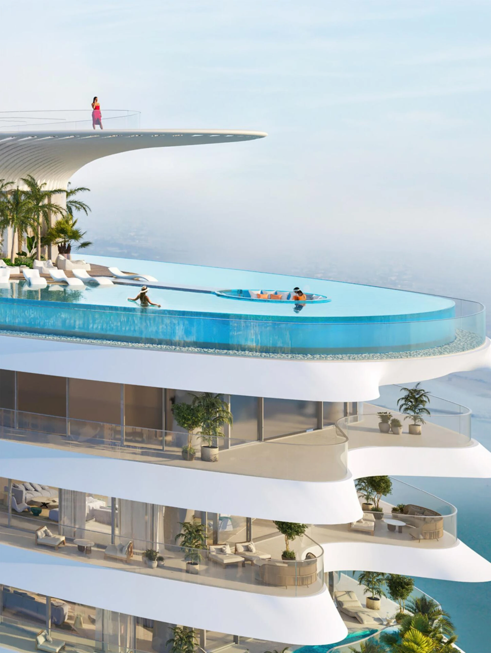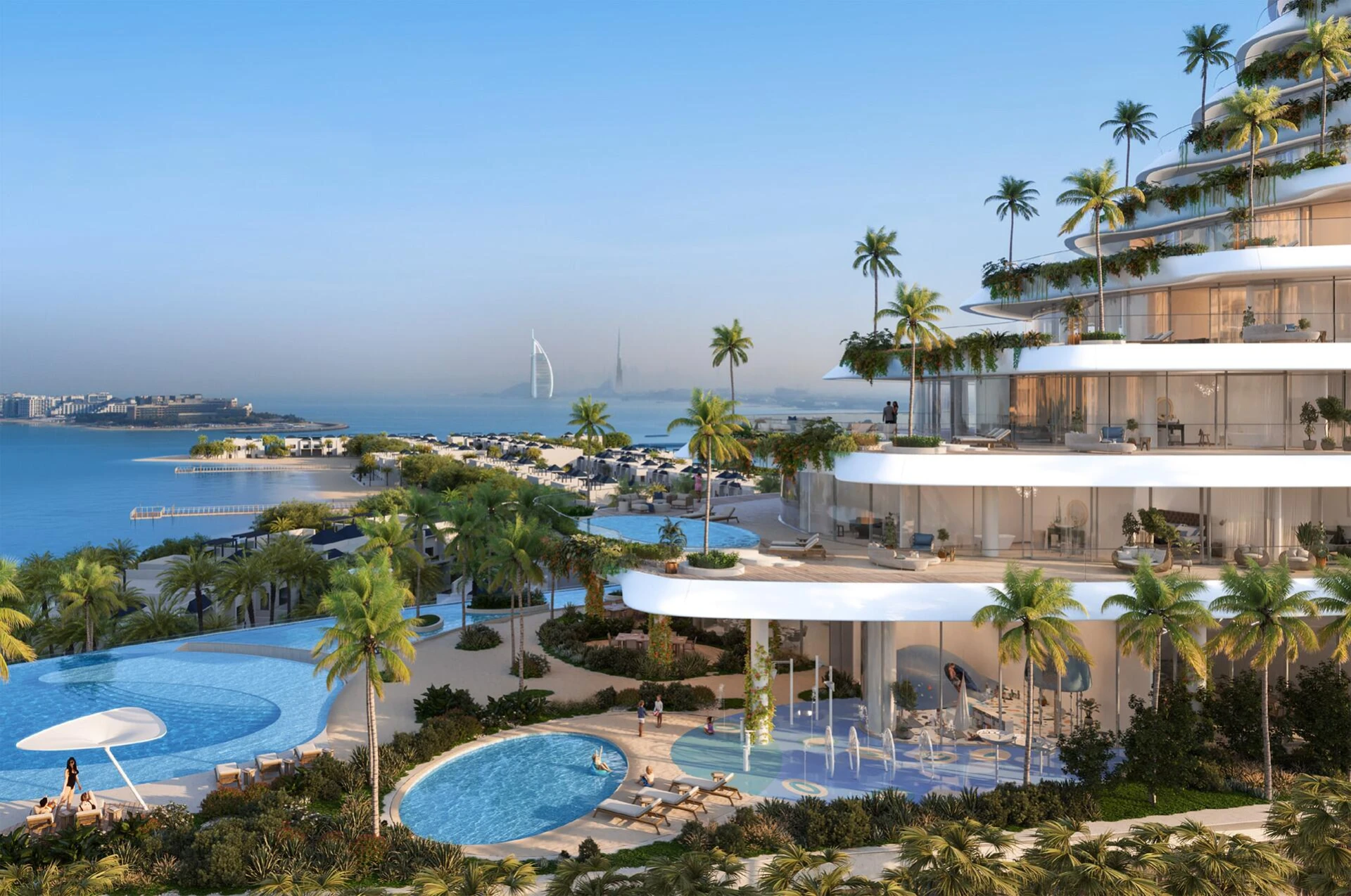 Vstúpte dnu a zažite novú úroveň sofistikovanosti. Každá rezidencia ponúka priestranné obytné priestory, doplnené o široké terasy zdobené súkromnými bazénmi a bujnou zeleňou, čím vytvára bezproblémovú kombináciu vnútorného a vonkajšieho bývania. Rozsiahle okná rámujú fascinujúce panorámy trblietajúceho sa pobrežia Dubaja a živého mestského prostredia.