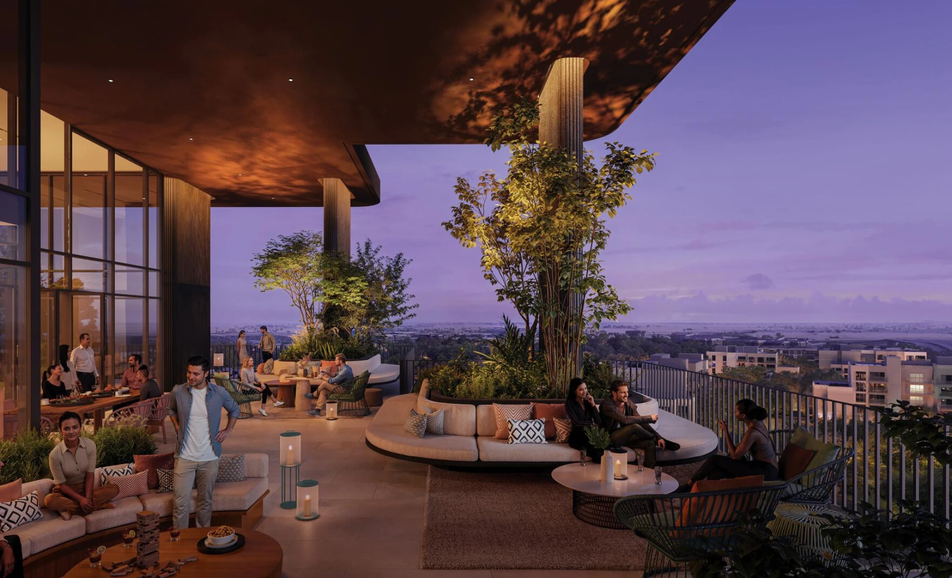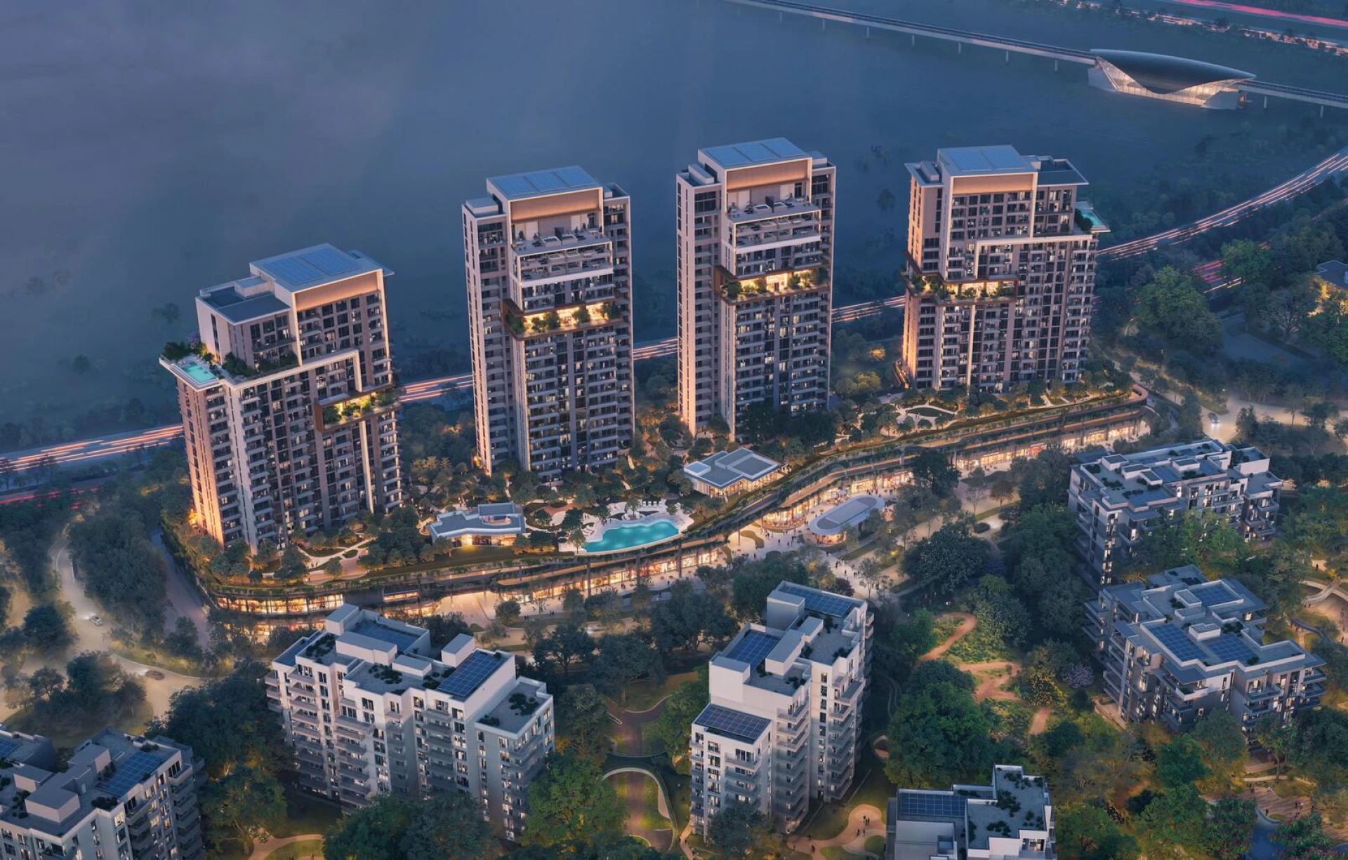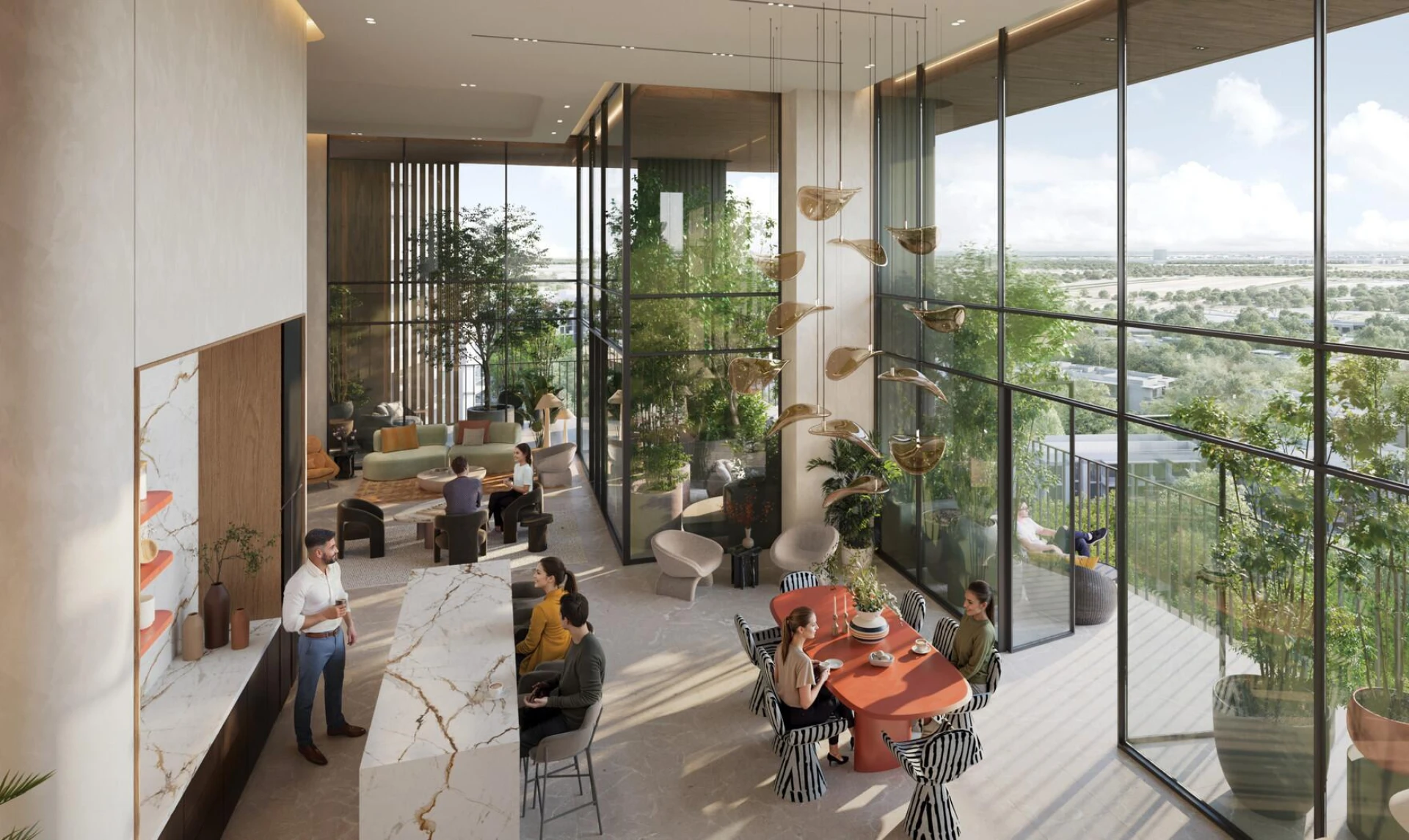 Discover Distrikt, an oasis of modern living where urban sophistication meets the tranquility of nature. Set within the lush Ghaf Woods forest community, Distrikt offers a unique blend of architectural elegance and natural harmony. Multiple towers rise gracefully among the trees, boasting a contemporary design with clean lines and warm facades that blend seamlessly into the landscape. Sky Gardens and Cloud Lounge spaces invite you to unwind above it all, while thoughtfully curated wellness and leisure zones provide places to recharge and connect.