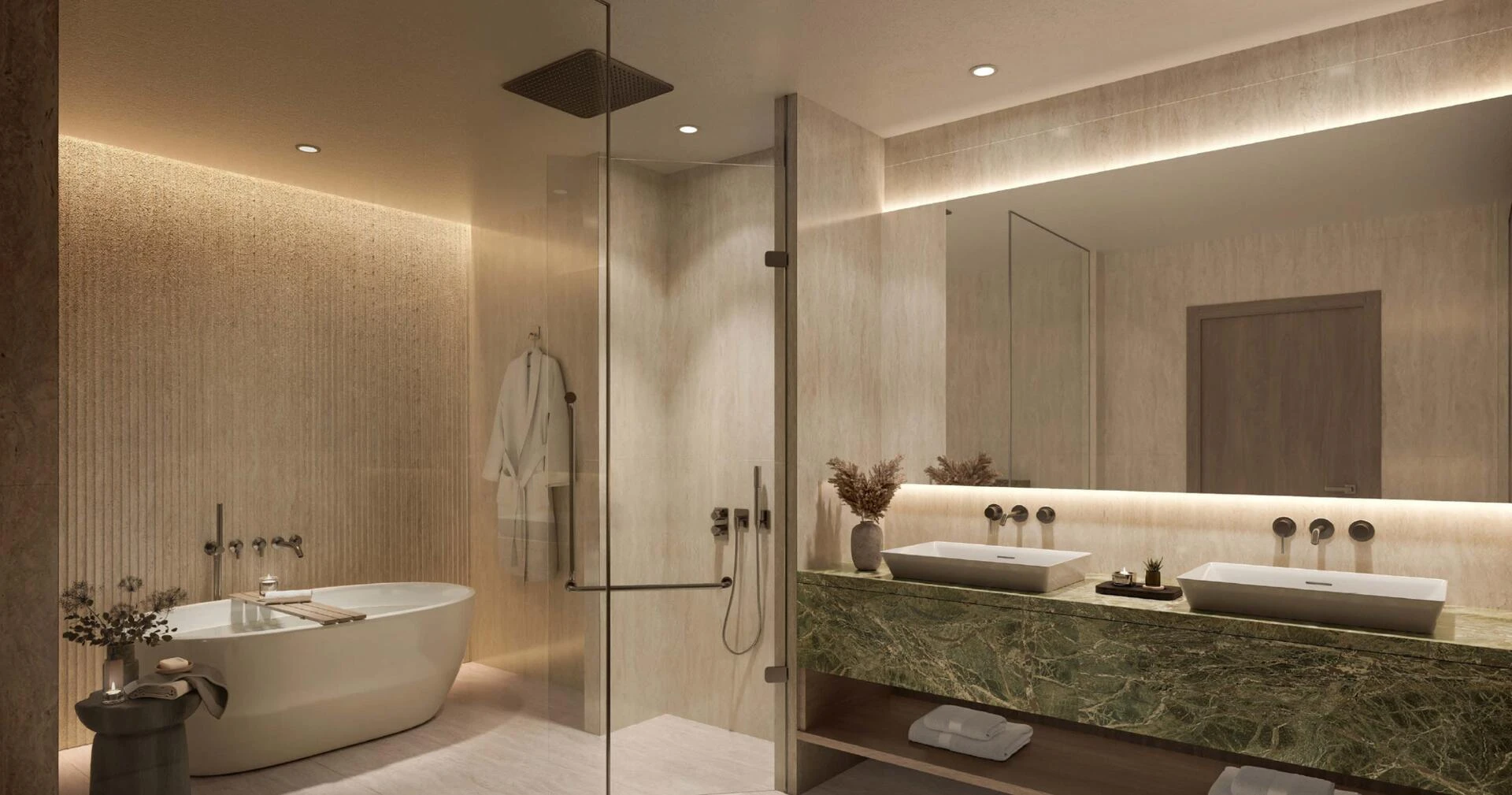Každá rezidencia vám umožňuje prispôsobiť si svoj priestor dvoma odlišnými interiérovými paletami. Vyberte si Lumoru pre osviežujúce, svetlé bývanie s detailmi zo zeleného mramoru, alebo si zvoľte Marwood pre útulnú atmosféru zvýraznenú bohatými drevami a výrazným červeným travertínom. Pôdorysy sú priestranné, s ukážkovými kuchyňami, samostatnými zázemím, šatníkmi, kúpeľňami v štýle wellness a rozsiahlými terasami alebo balkónmi - ideálne pre bezproblémové vnútorné a vonkajšie bývanie.