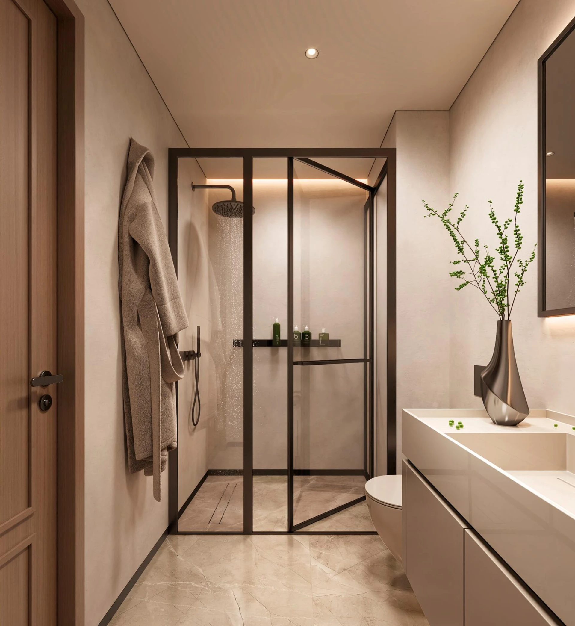 Vo vnútri čaká starostlivo vybraná kolekcia štúdií až po trojizbové byty, všetky plne dokončené a zariadené s kvalitnými kuchynskými spotrebičmi. Interiéry vyžarujú teplo a pokoj, kombinujúc prírodné textúry ako drevo, kameň a jemné textílie. Inteligentné využitie slnečného svetla a priestoru vytvára pozývajúcu svätyňu, kde sa bez námahy stretáva pohodlie a súčasný štýl, navrhnuté tak, aby zlepšili každodenný život jeho obyvateľov.
